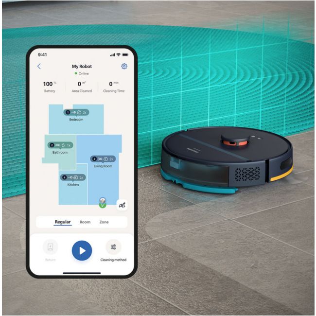 Zmień swój sposób sprzątania i przejdź na odkurzanie i mycie w jednym. Dzięki dużej mocy ssania robota możesz spodziewać się nieskazitelnych podłóg i dokładnego sprzątania, ze szczególnym uwzględnieniem dywanów, a wszystko z łatwością kontrolujesz za pomocą aplikacji Home Run.