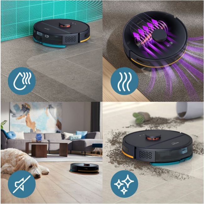 - Jednoczesne odkurzanie i mycie - Bateria wymienna - Automatycznie zwiększa siłę ssania na dywanach - Tworzenie mapy - 4 poziomy mocy ssania